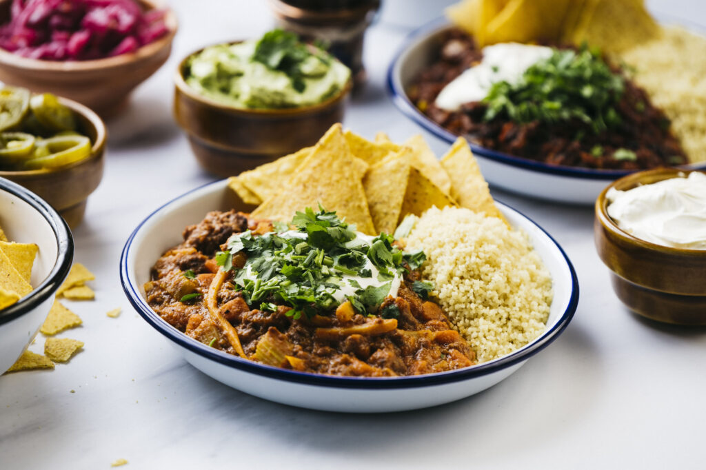 Unsere Speisekarte halten wir extra klein, um die Qualität so hoch wie möglich zu halten. #NOBULLSHIT 4 Chili-Kreationen gibt’s immer: Zwei davon mit Fleisch, zwei vegan. Dazu servieren wir Couscous, Sour Cream und Nachos. Außerdem haben wir wechselnd ein Chili der Woche im Angebot – immer aus einem anderen Teil der Welt.