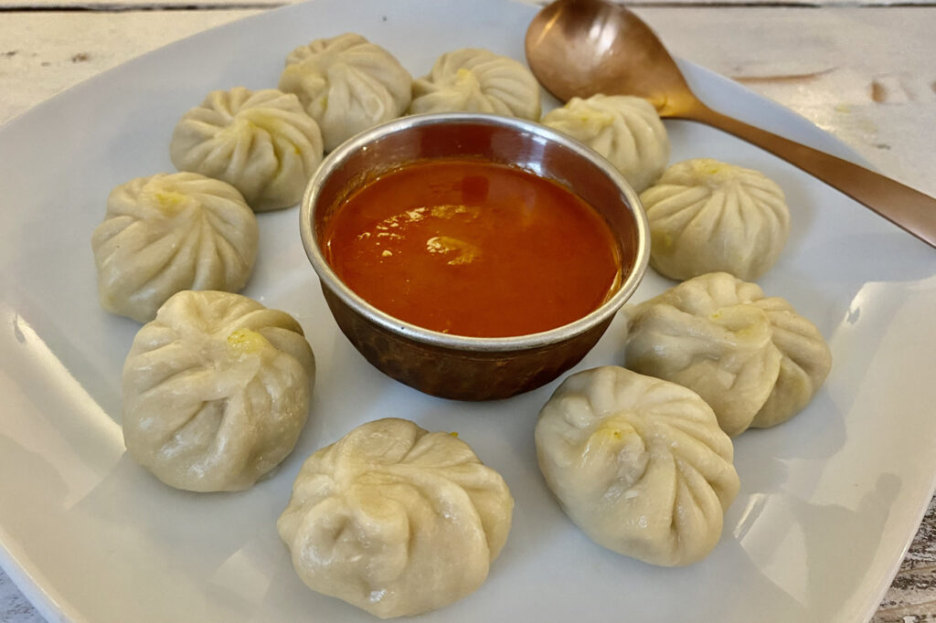 Spezialiäten des Hauses sind die Momos, kleine, in Dampf gegarte Teigtaschen, die traditionell tibetisch und nepalesisch vor allem für Gäste und Freunde zubereitet werden, auch als vegetarische Variente möglich zubereitet werden können.