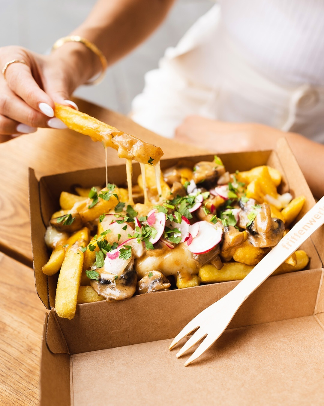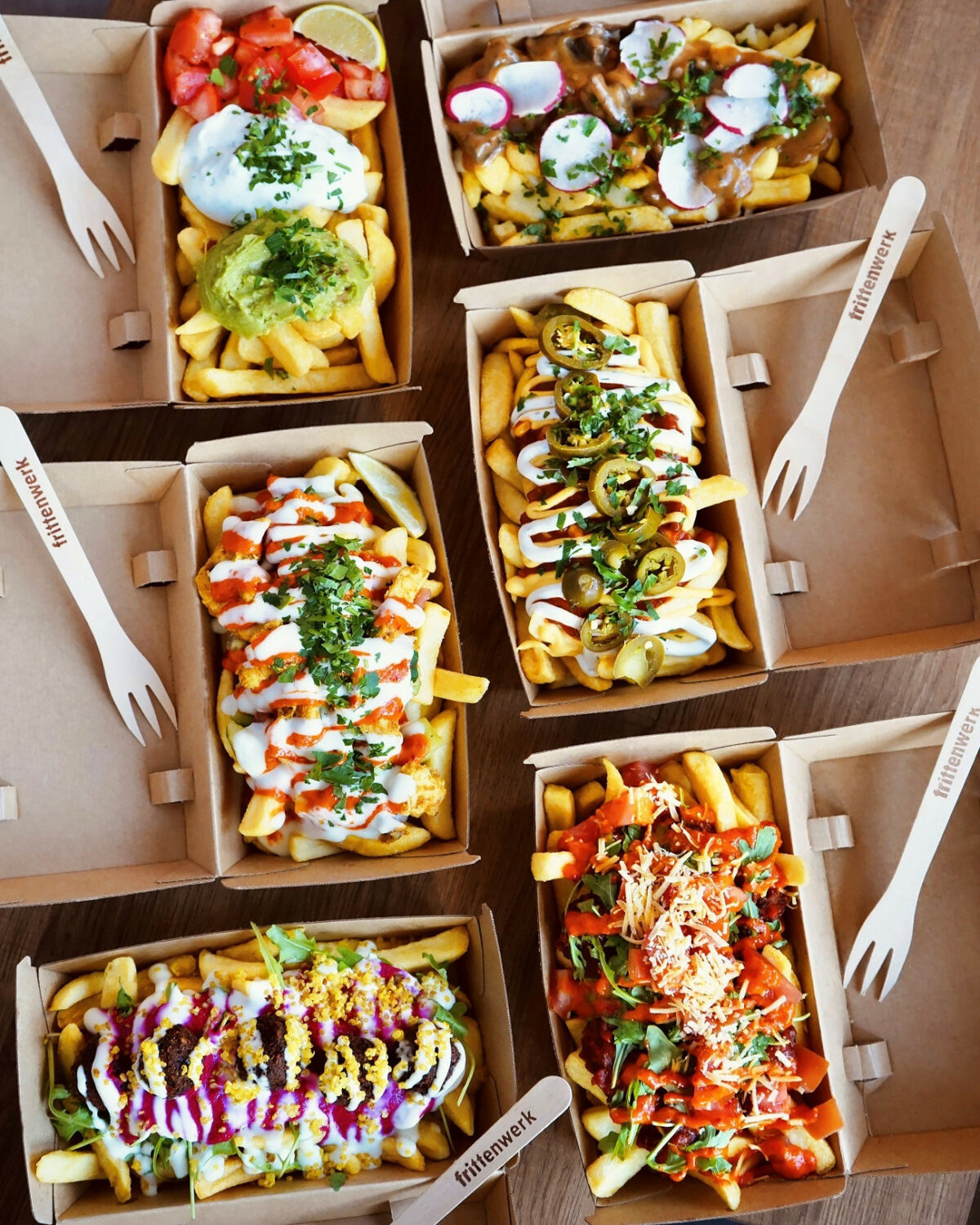 „Poutine“ heißt so viel wie „Sauerei“. Statt mit einem Klecks Ketchup oder Mayo werden die Fritten hierbei nämlich mit aufregenden Toppings und Saucen garniert. Das kann mitunter ganz schön matschig werden – und ist eine vollwertige, sättigende Mahlzeit. Frische Zutaten sowie Saucen und Toppings ganz ohne Zusatzstoffe und Geschmacksverstärker leben eine bewusste Esskultur vor. Mit vielen Optionen für Vegetarier und Veganer. Und so grün das Frittenwerk von innen aussieht, so nachhaltig ist auch das Konzept.