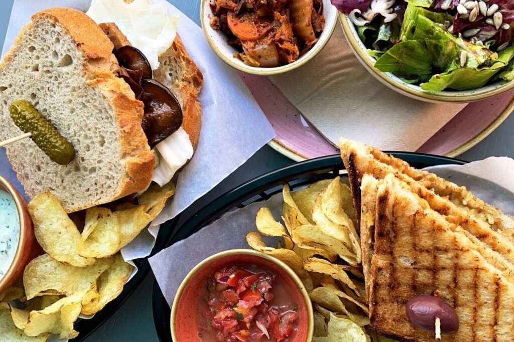Im OM NOM NOM gibt es Frühstück, Mittagessen sowie Kaffee und Kuchen. Besonders: die vegane Käsetheke, etwa mit Cashew-Camembert, und die hausgemachten fermentierten Getränke wie Kombucha.