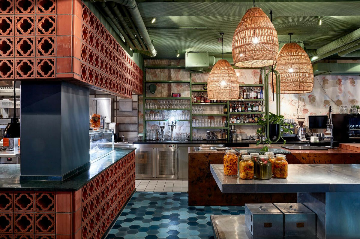 Frisches Pitabrot aus dem Ofen, Jerusalem-Kebap auf offenem Feuer, Grüne Soße aus Mittelmeerkräutern, eine Showküche und ein bisschen Chaos.