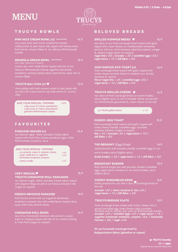 Unsere TRUCY verwöhnt euch mit den leckersten Smoothie Bowls & Cinnamon Rolls der Stadt. Jeden Tag kreiert unsere liebe Yasmin eine große Auswahl von #HHomemade Cakes – meist vollständig Vegan. Schwebt ihr auf Wolke 7? Unser Pancake Heaven wird euch auf Wolke 10 schweben lassen. Ihr mögt es herzhaft? Huii, wir haben unsere leckeren Breakkys – Brioche mit Avocado, Rührei, Cheddar & unsere #HHomemade Mayonnaise – oder doch lieber ein leckeres Brot mit veganem Frischkäse, saftigen Avocadoscheiben, Rührei und Burrata? Zudem gibt es leckere Kaffeespezialitäten, frische Smoothies & cremige Shakes zubereitet von unserem Star-Barista Alex. Ach, und #HHomemade Lemonade, Cocktails & leckeren Wein gibt es auch. TRUCY & das ganze Team freut sich auf Euch!