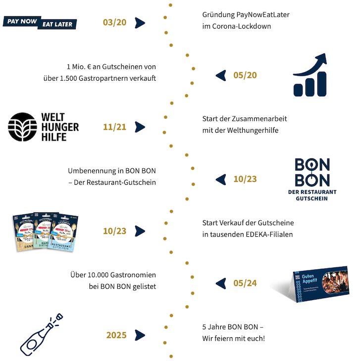 Und nun, da Corona weitestgehend überwunden ist, machen Restaurantbesuche wieder umso mehr Spaß, sodass wir ab Oktober 2023 mit unserem neuen Namen und gemäß dem Motto “Gut. Besser. BON BON.” unseren Restaurant-Gutschein zum besten Geschenk für alle Anlässe machen wollen. Dafür stehen wir morgens auf & bleiben abends auch gerne mal sitzen.